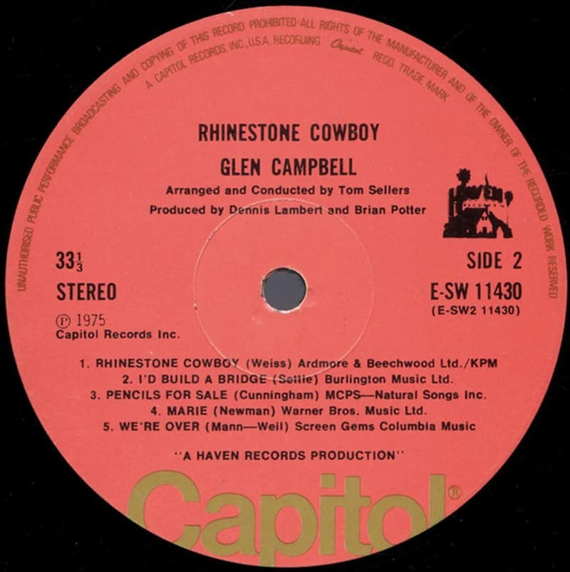 Furthermore, “Rhinestone Cowboy” was one of the six songs released in 1975 that topped both the Billboard Hot Country Singles and Hot 100 charts. The five other songs were “Before the Next Teardrop Falls” by Freddy Fender, “(Hey Won’t You Play) Another Somebody Done Somebody Wrong Song” by B. J. Thomas, “Thank God I’m a Country Boy” and “I’m Sorry“/”Calypso,” both by John Denver, and “Convoy” by C. W. McCall.