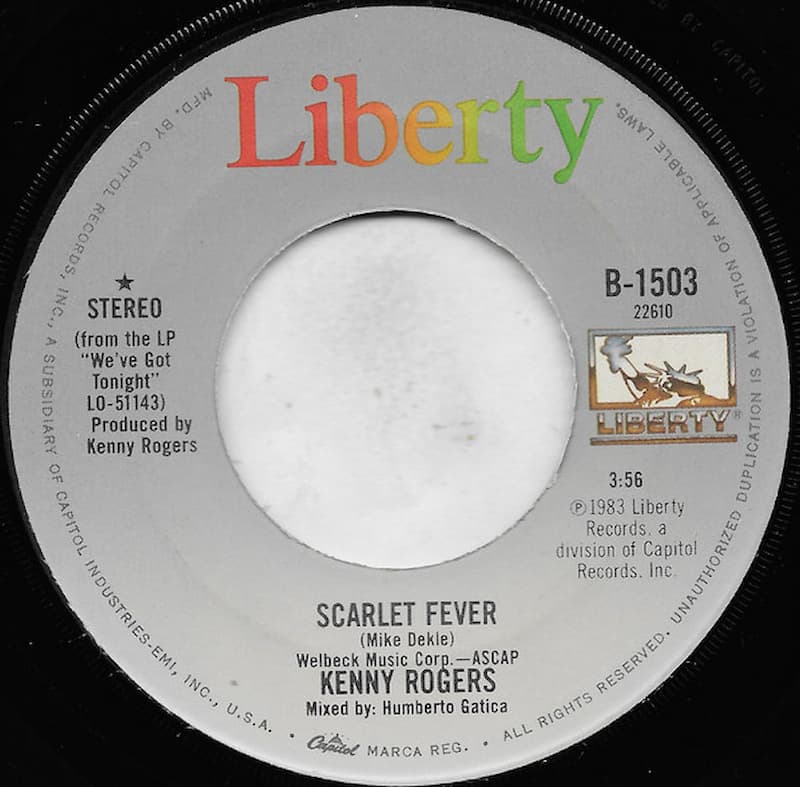 “Scarlet Fever” is a 1983 single by Kenny Rogers, written by Georgia songwriter Mike Dekle. The track was released by Liberty Records in June 1983 as the third single from Rogers’ fourteenth studio album, We’ve Got Tonight. On the LP it appears on side one, directly after the title track. Single and discography listings give a running time of about 3:56, with “What I Learned from Loving You” on the B-side. The performance is credited simply to Kenny Rogers, with Rogers himself listed as producer.