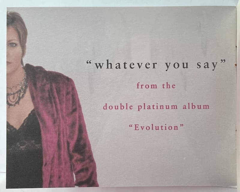 “Whatever You Say” was issued as the fifth and final single from Martina McBride’s fourth album, Evolution, which was a multi-platinum success. The song was released as a single to country radio in early 1999, peaking at number 2 on the Hot Country Songs chart and number 37 on the Billboard Hot 100, becoming one of two singles spawned from the album that reached number 2 (“Happy Girl” was the first). The song also reached a peak of number 6 on the Canadian RPM chart that same year, becoming her sixth Top 10 on that chart.